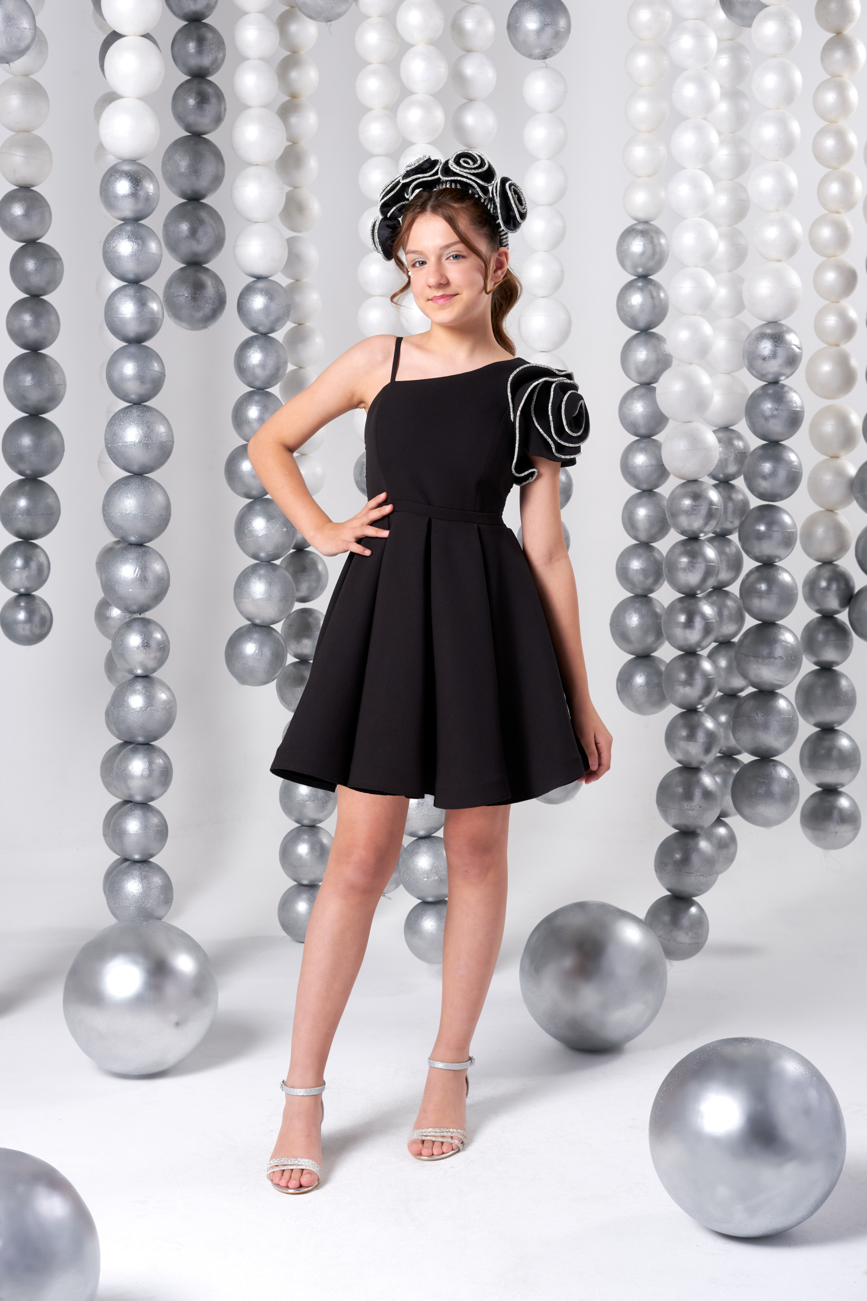 Özel günlerin vazgeçilmezi olan bu zarif siyah abiye elbise, tek omuz tasarımı ve gül detayıyla şıklığı zirveye taşıyor. Kız çocukları için özel olarak tasarlanan bu model, modern kesimi ve dökümlü eteğiyle hem rahatlık hem de estetik sunar. Doğum günü, düğün, bayram ve mezuniyet gibi tüm özel günlerde fark yaratmak isteyen minikler için ideal bir tercihtir. Kaliteli kumaşı sayesinde konforlu bir kullanım sağlar. Gümüş detaylı ayakkabılarla tamamlandığında göz alıcı bir kombin oluşturur.