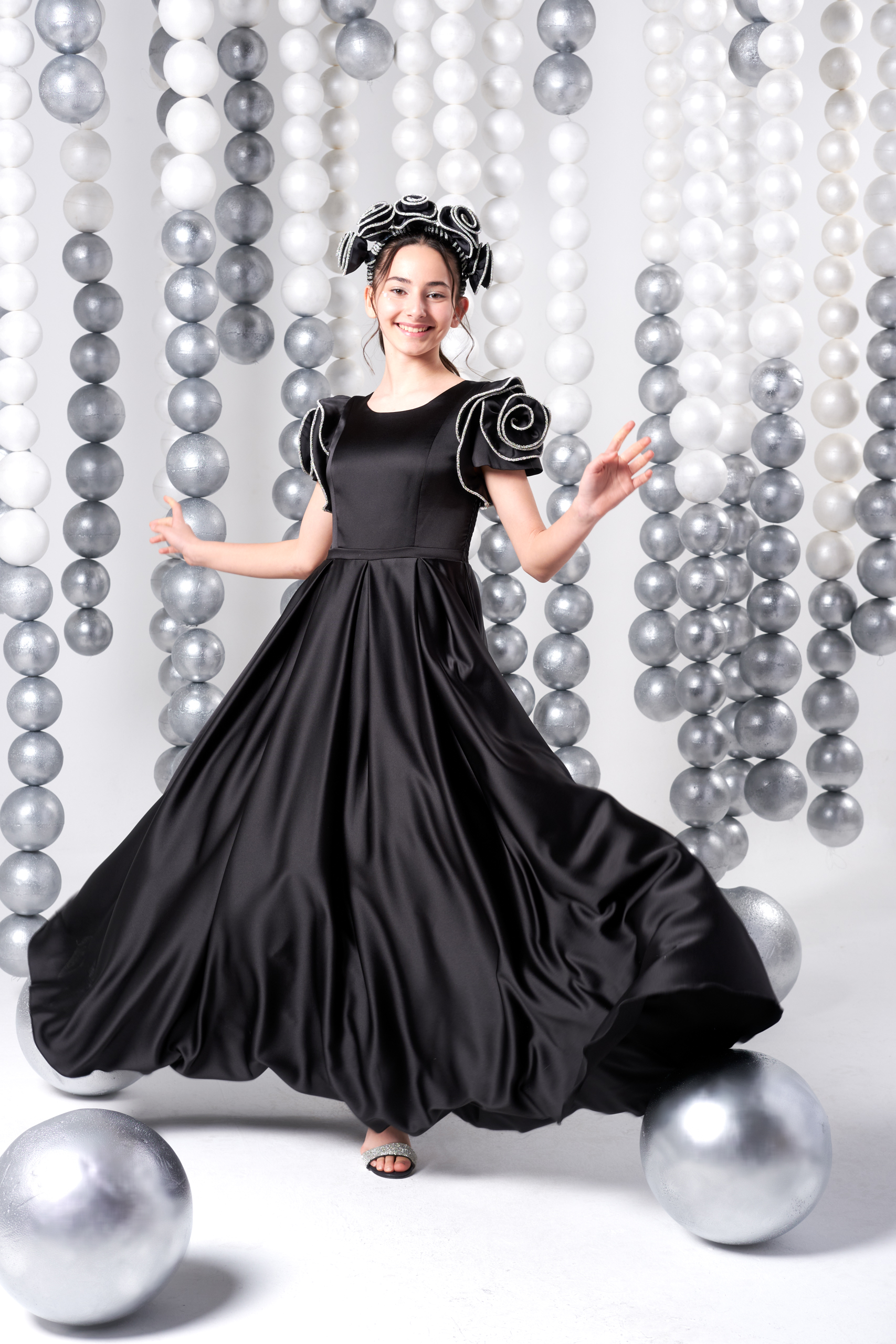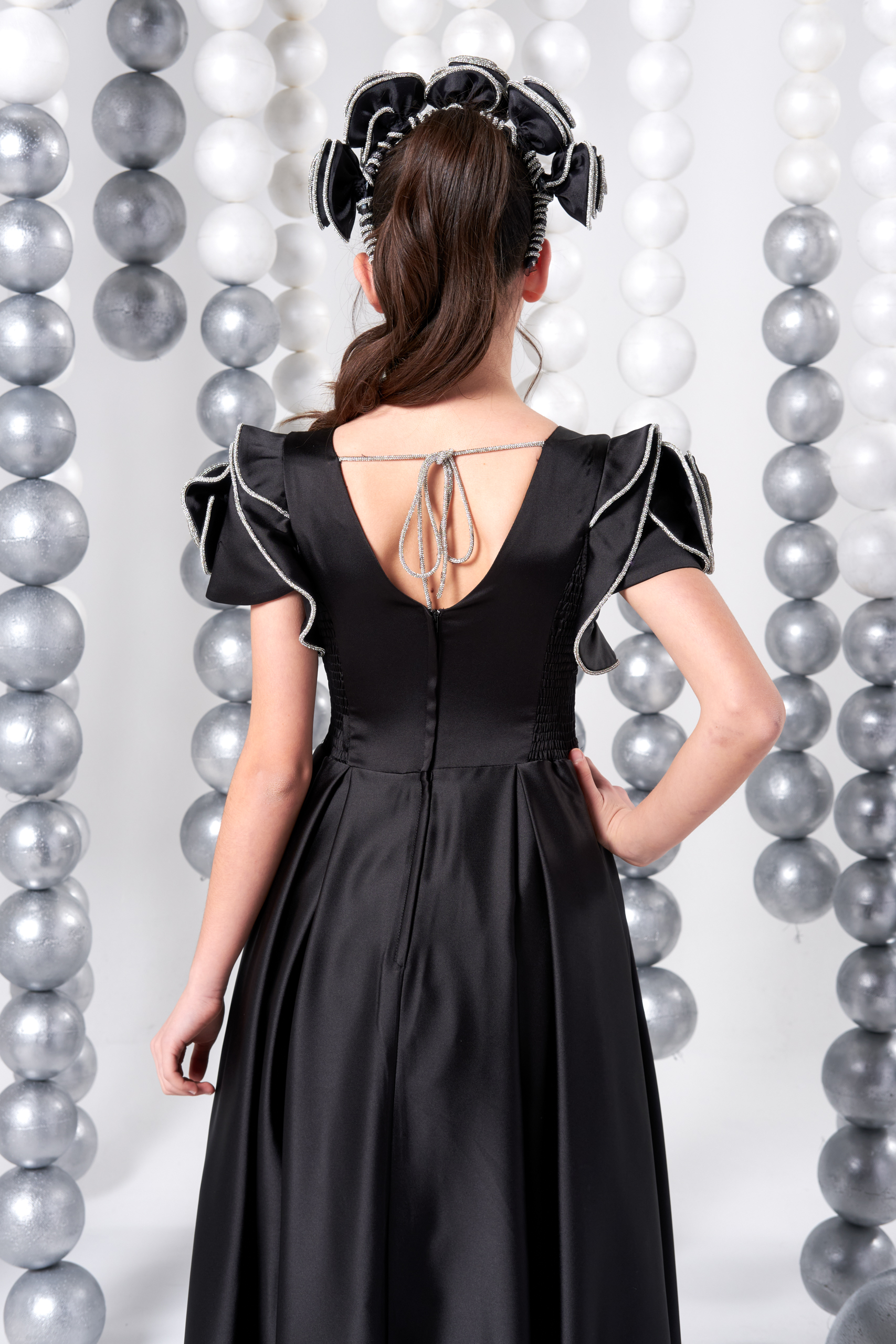 Omuzdan kabarık, gül şeklinde volan kol tasarımı hem klasik hem de masalsı bir duruş sunarken; parlak siyah kumaşı ile şıklığı zirveye taşır. Doğum günü, mezuniyet, düğün, bayram ve özel organizasyonlar için mükemmel bir tercihtir.