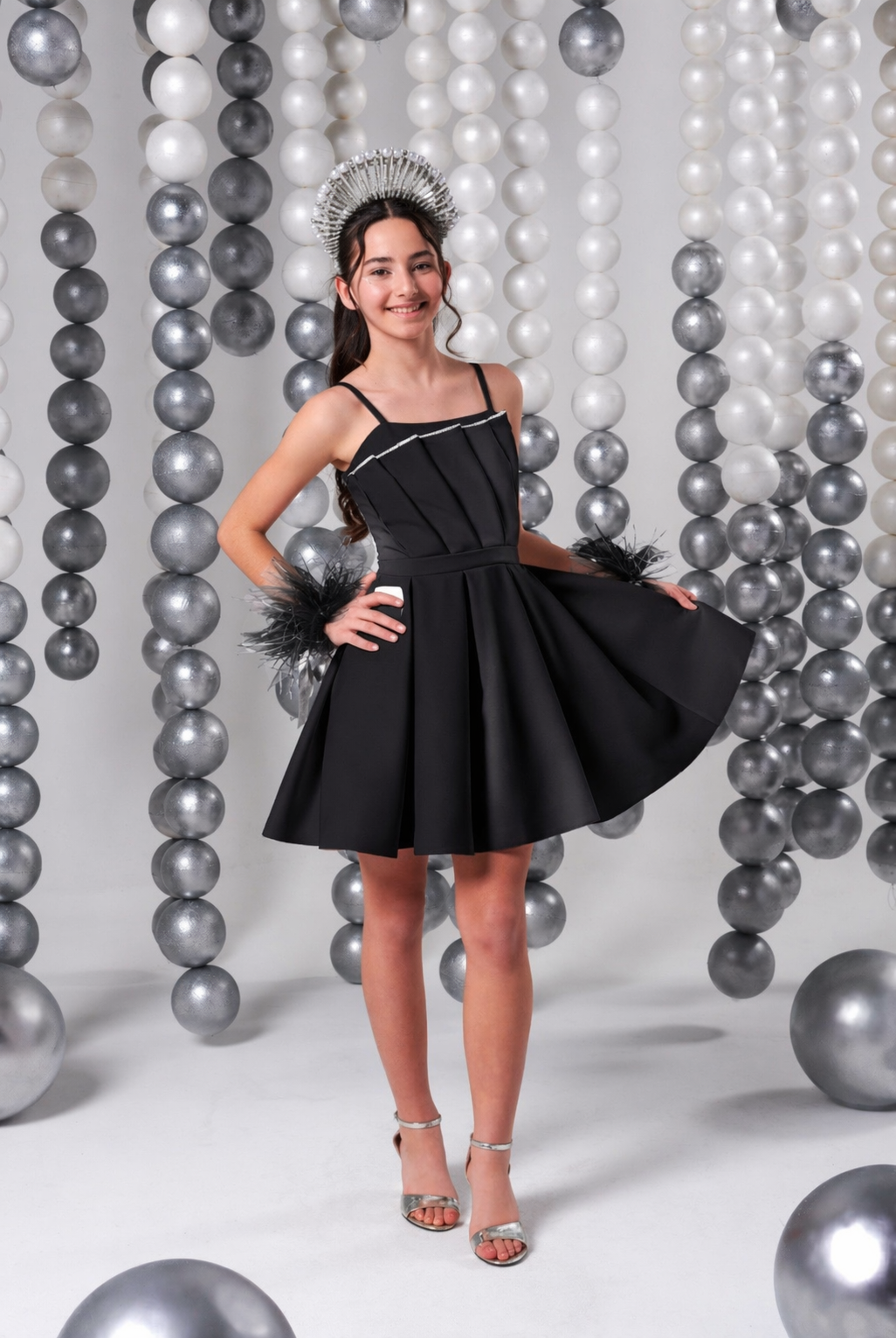 Genç kızlar için özel olarak tasarlanmış bu siyah abiye elbise, zarafeti ve modernliği bir araya getiriyor. İnce askılı yapısı, pliseli üst detayı ve geniş etek kesimiyle hem şık hem de rahat bir görünüm sunar. Mezuniyet, nişan, doğum günü ve özel davetlerde öne çıkmak isteyen genç kızlar için ideal bir tercihtir. Kaliteli kumaşı sayesinde gün boyu konforlu bir kullanım sağlar. Işıltılı aksesuarlarla kombinlenerek stil sahibi bir görünüm elde edilebilir.