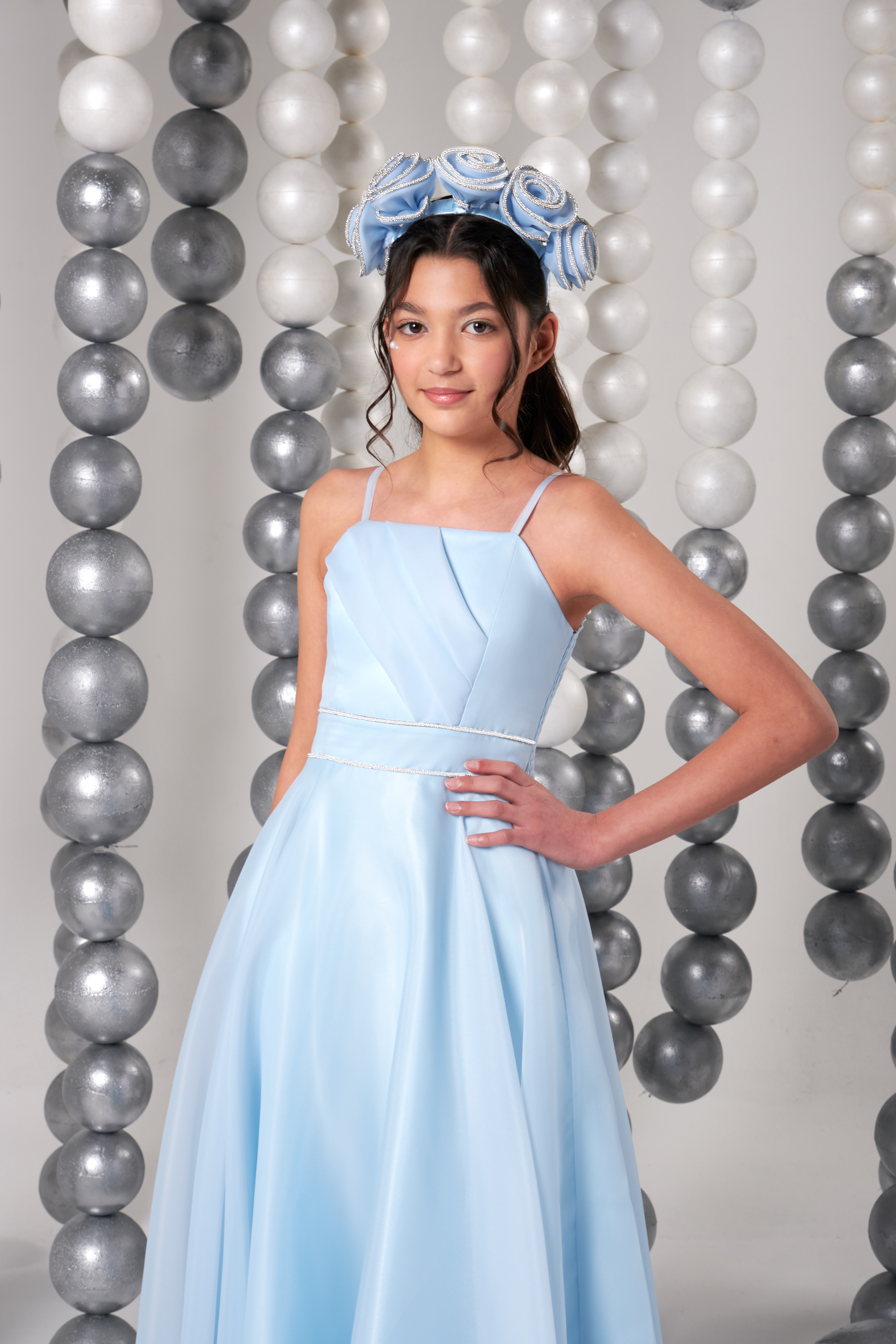 Masallardan ilham alınarak tasarlanan bu mavi prenses elbise, özel günlerin yıldızı olmak isteyen minikler için mükemmel bir tercih! Omzu açık tasarımı ve uzun şifon kolları zarif bir duruş sağlarken, bel kısmındaki taş detayları ışıltı katıyor. Saç aksesuarıyla tamamlanan bu kombin, doğum günü, mezuniyet, sahne ve düğün gibi özel organizasyonlar için göz alıcı bir görünüm sunar.
